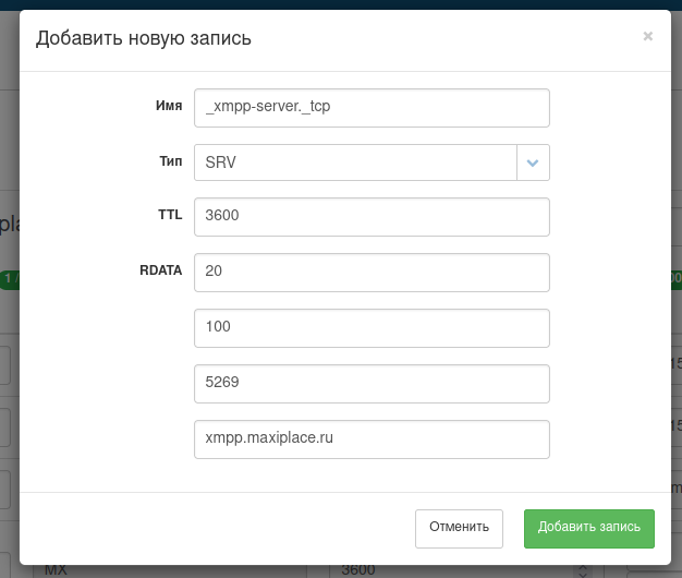 Добавление ресурсных записей (A, CNAME, MX, NS, SRV, TXT)