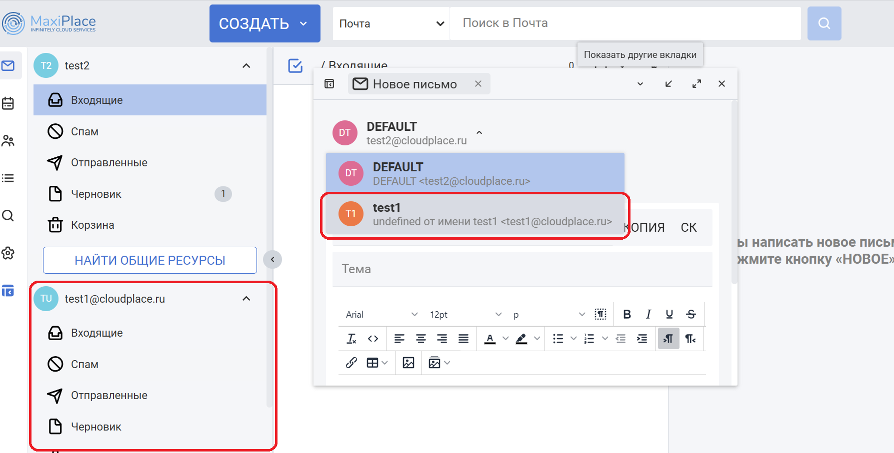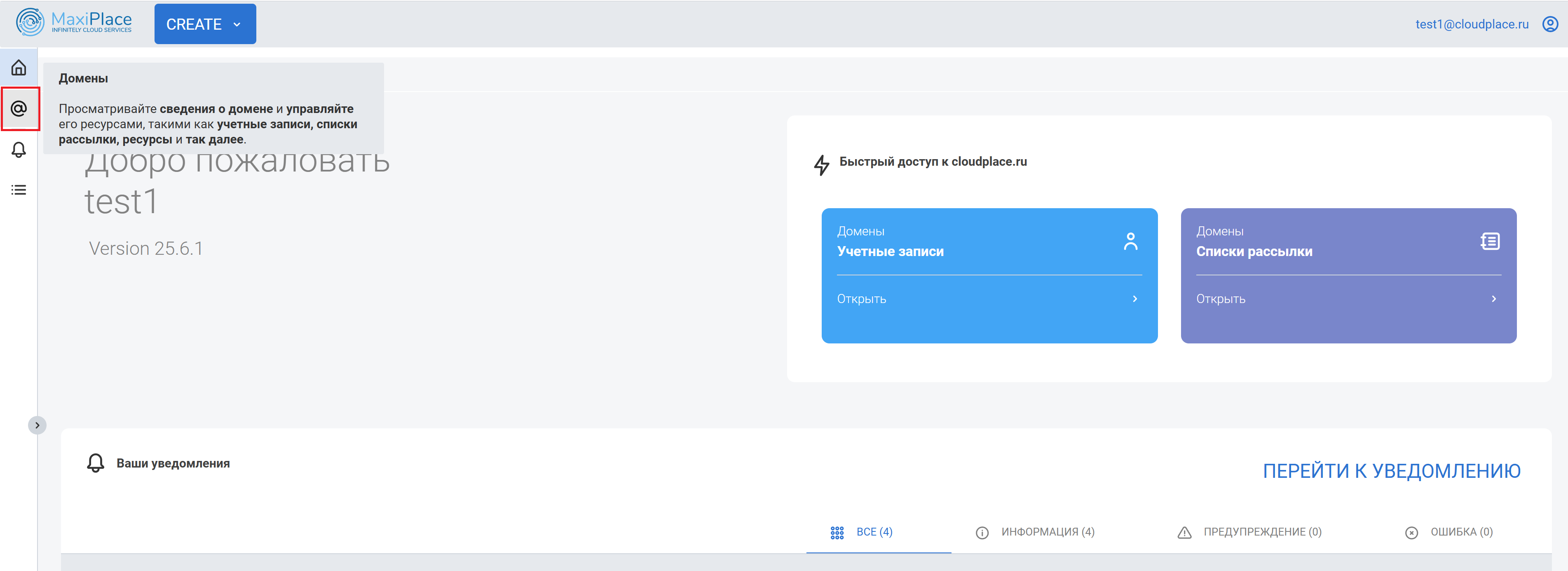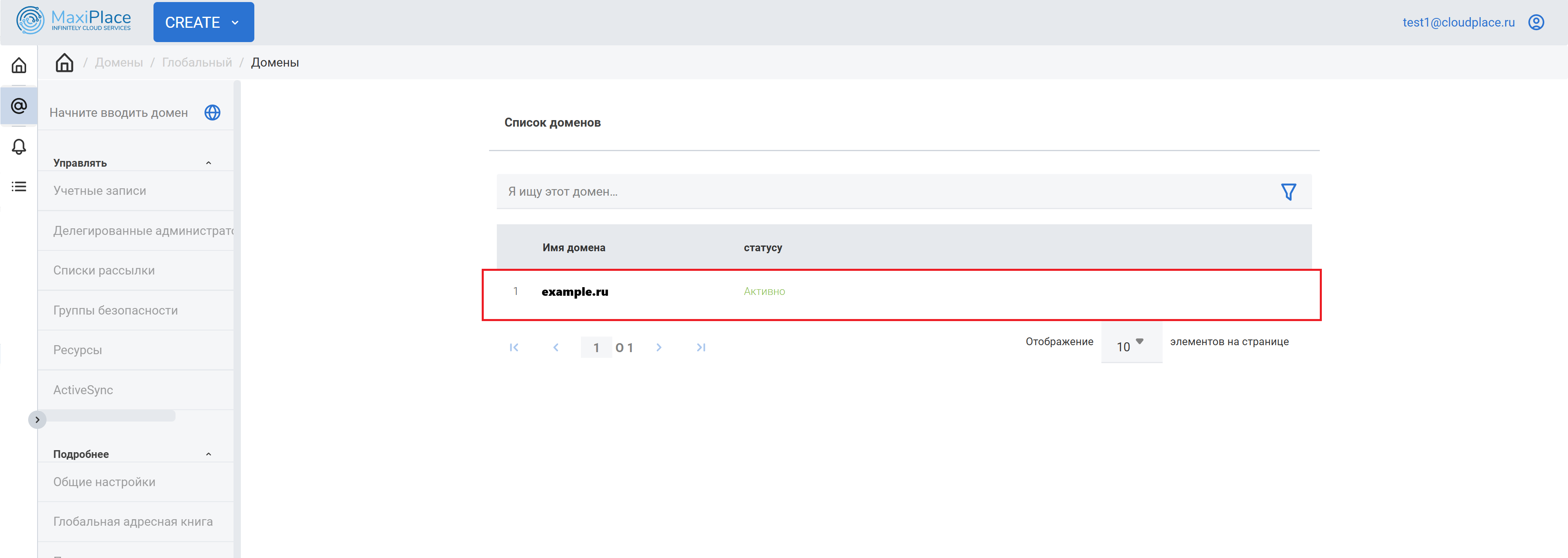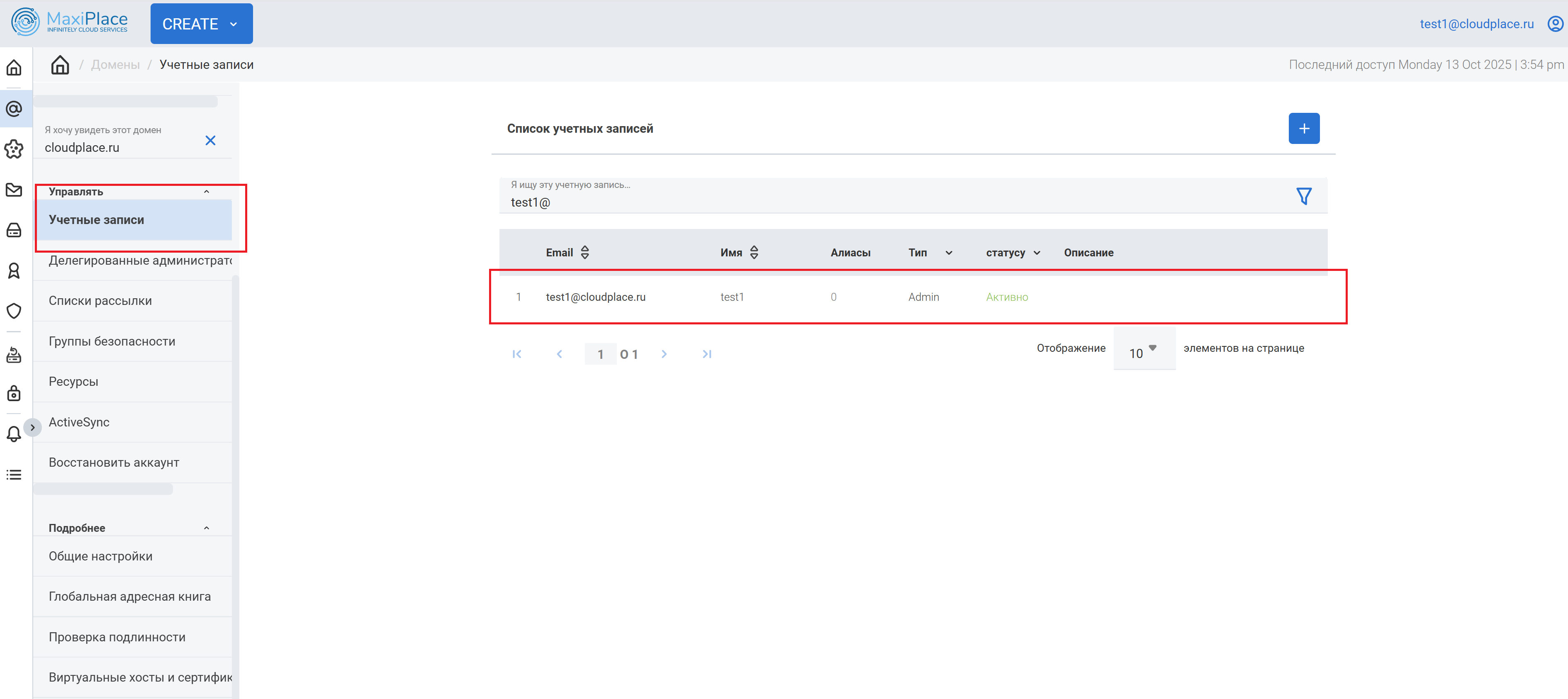 Откройте административный интерфейс по адресу: https://mail.cloudplace.ru:6071