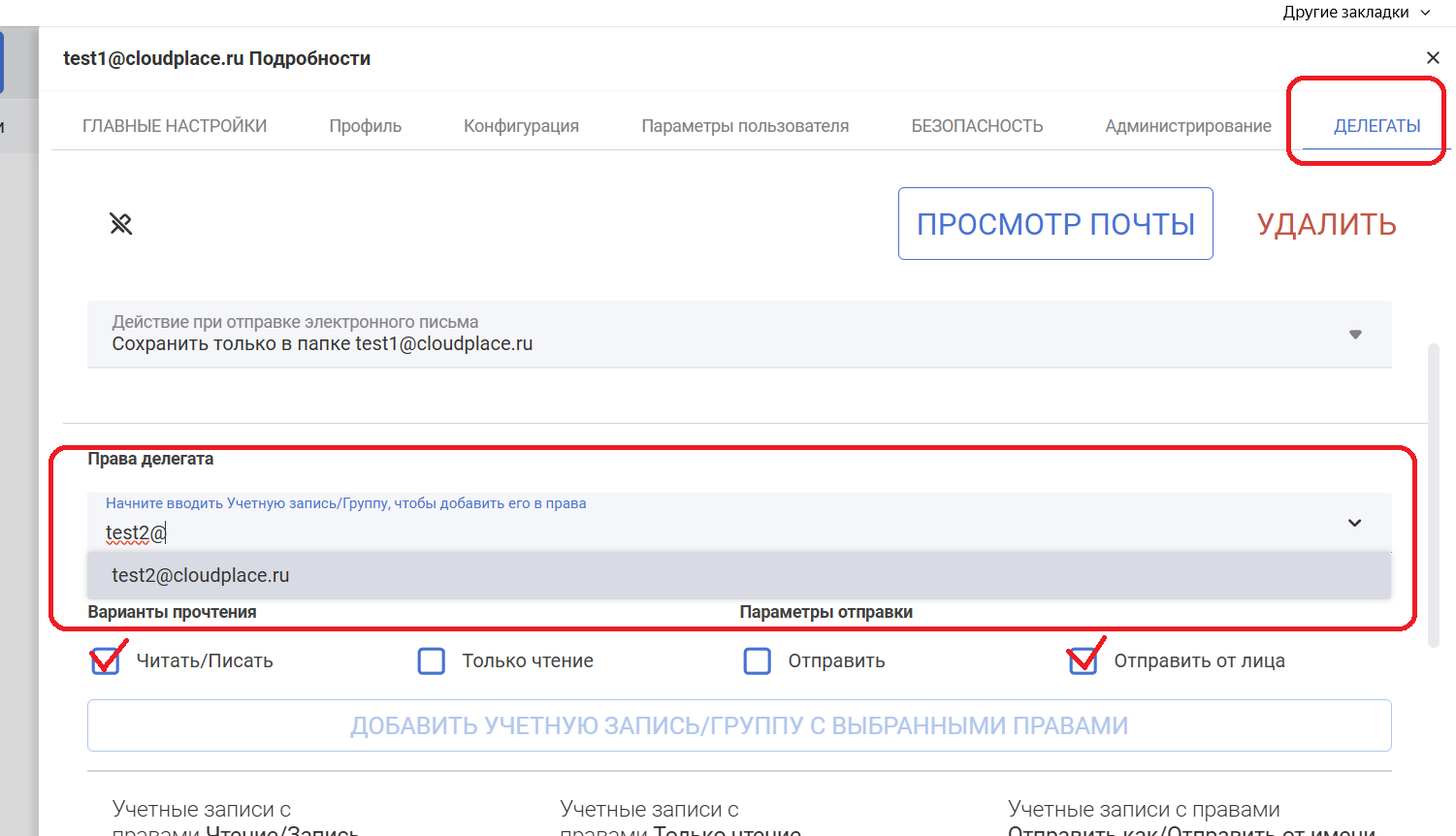 6. В поле «Права делегата» начните вводить e‑mail пользователя, которому даёте доступ (например, user2@…) и выберите его из подсказки.